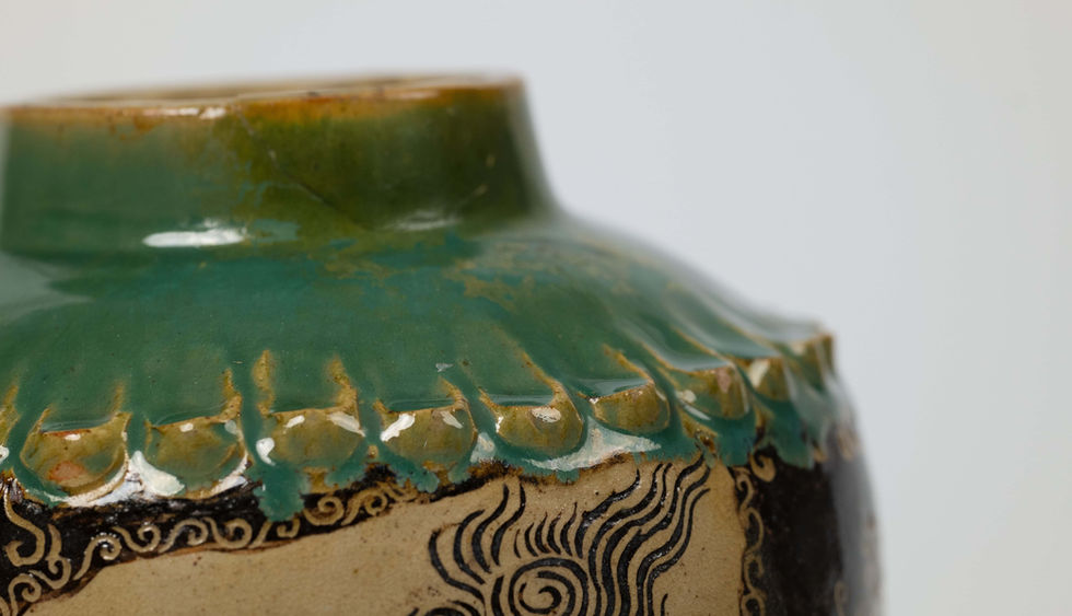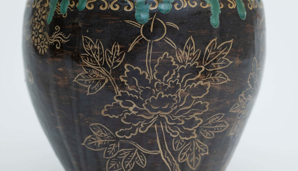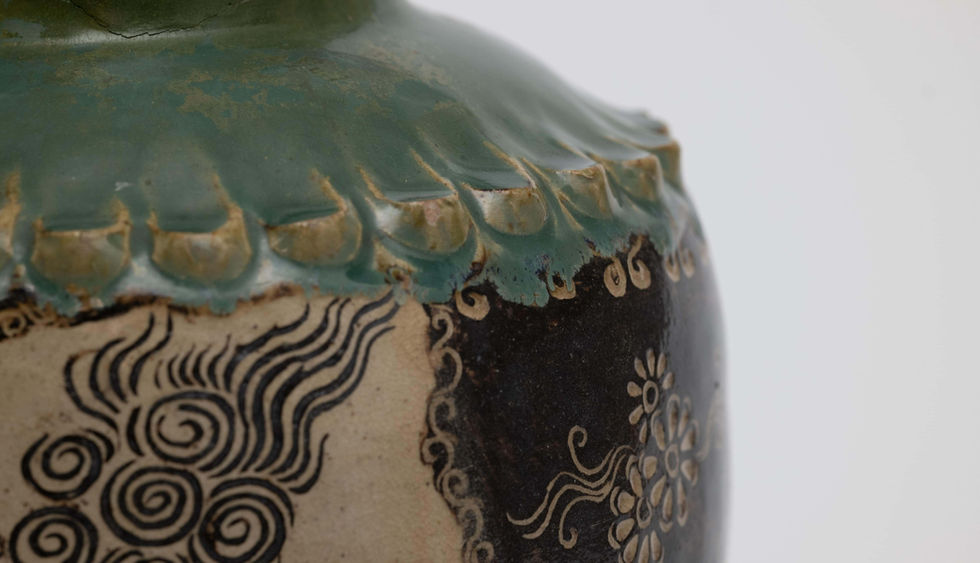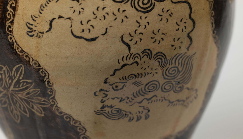 正面は窓絵的に白地に獅子を掻落し、残りを黒地に唐草と牡丹を掻落した入念な技巧。粒子の細かい白土のロクロ成形で一箇所の胴継ぎ有り。